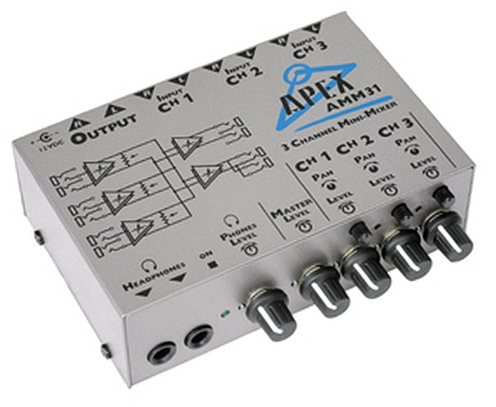 The Apex AMM31 micro-mixer can accept either mono or stereo signals and mixes them down to stereo or identical L&R mono signals.