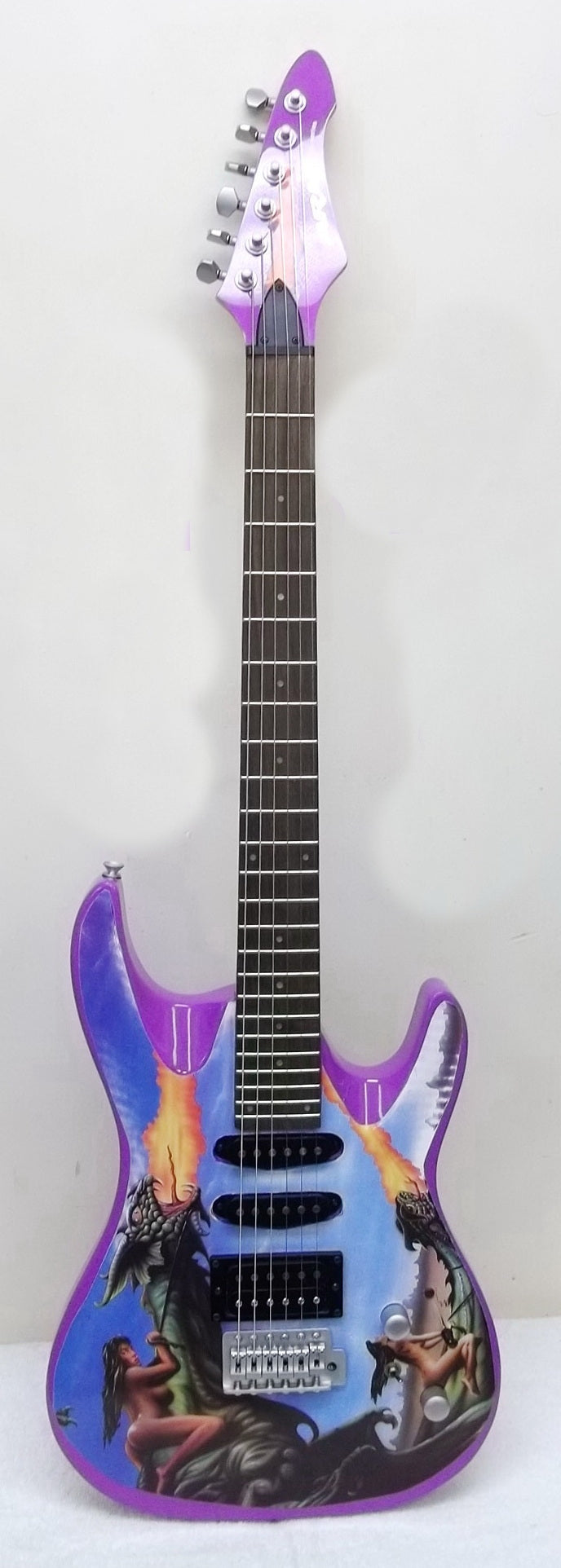This Aria Graphic MAC model features H/S/S pickups with coil-tap switch for the bridge humbucker,