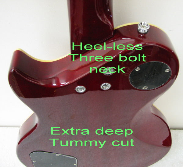 An LP style with a few twists. Unlike most LP style guitars that have chunky baseball bat necks,this one features a slimmer profiled "D" neck that won't cramp your hand after an hour's playing.