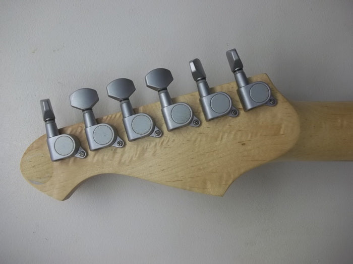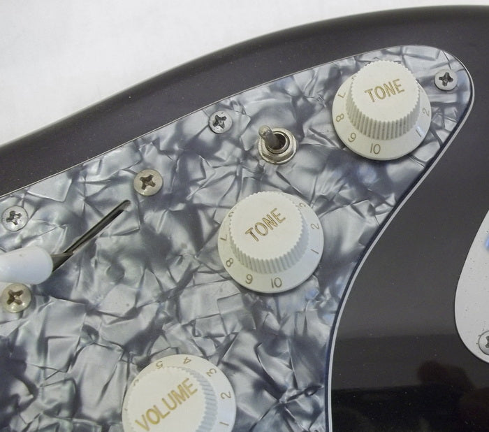 The classic 6-point vibrato bridge,diecast tuners are all done in a subdued ,matte satin grey finish.The pearloid pattern pickguard also makes a nice contrast to the black gloss body