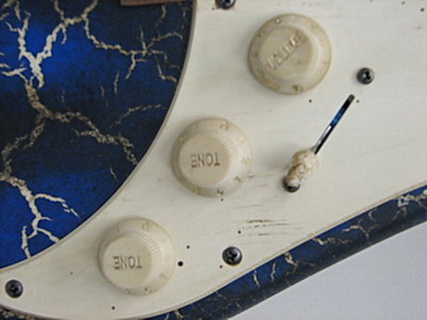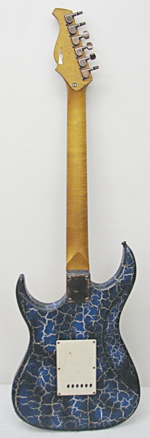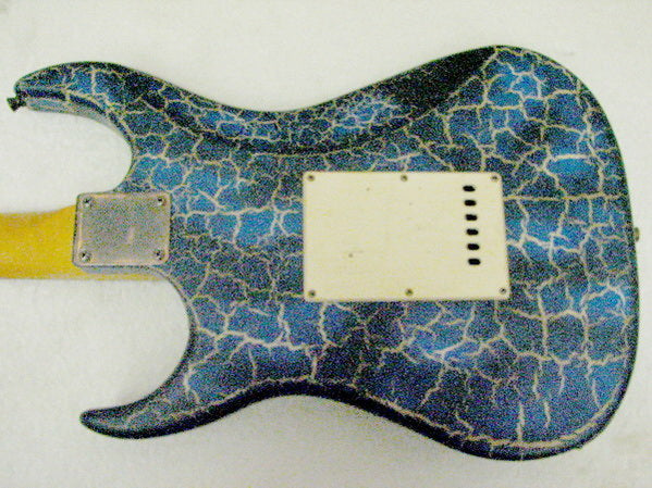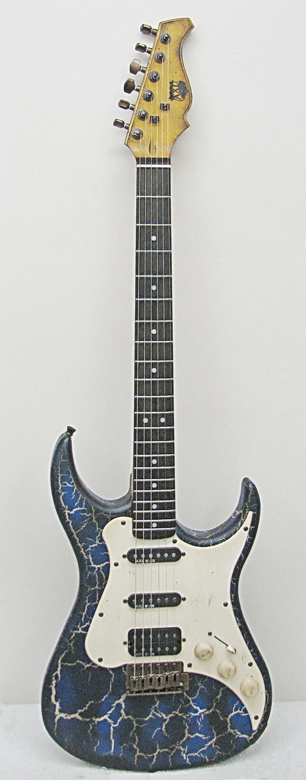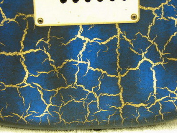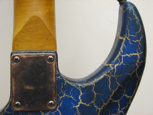 With a uniquely distressed solid alder body,the crackle blue finish looks like it was pulled deep from the ocean floor and brought up to the surface! Anodized,antiqued hardware.EMG designed pickups. Rock maple neck with 25.5 inch scale,rosewood fingerboard,diecast,adjustable tuners,branded headstock logo,scorched/roasted ,aged neck tint.