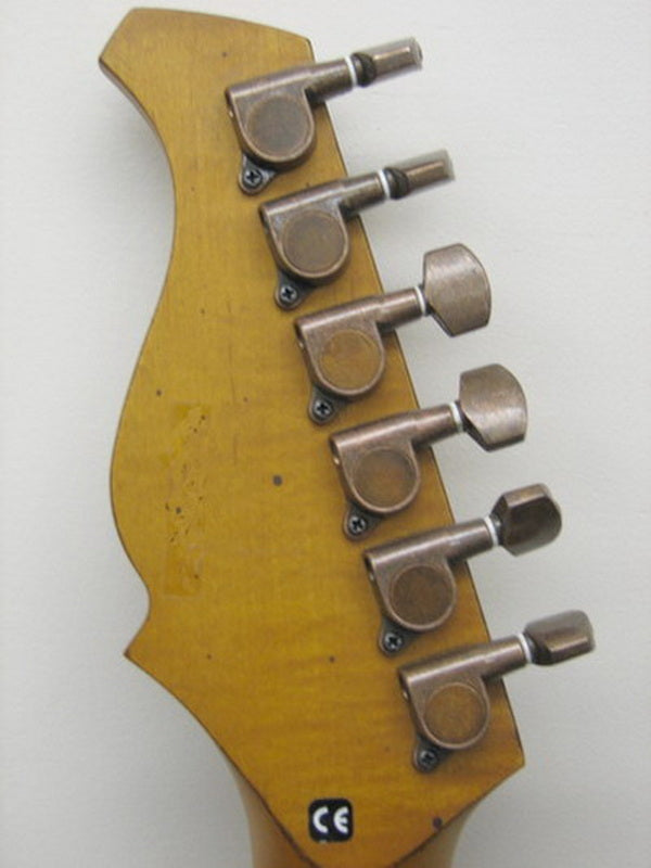With a one-of-a-kind,distressed,body finishe,antiqued, etched hardware and the aged,flamed "singed" neck treatments,this Badwater guitars definitely look like no other,for the player wanting to add something very different looking to his guitar line-up.