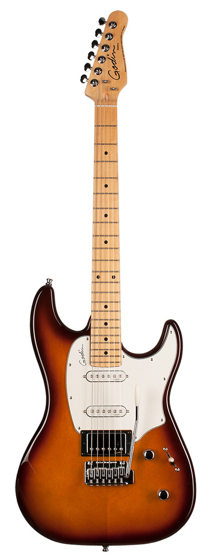 The Session features a rock maple neck with maple fingerboard, Canadian Laurentian Basswood body, 2x Godin GS-1 single-coils housed in a vintage white pickguard and a Godin humbucker in the bridge, along with a 5-way switch,