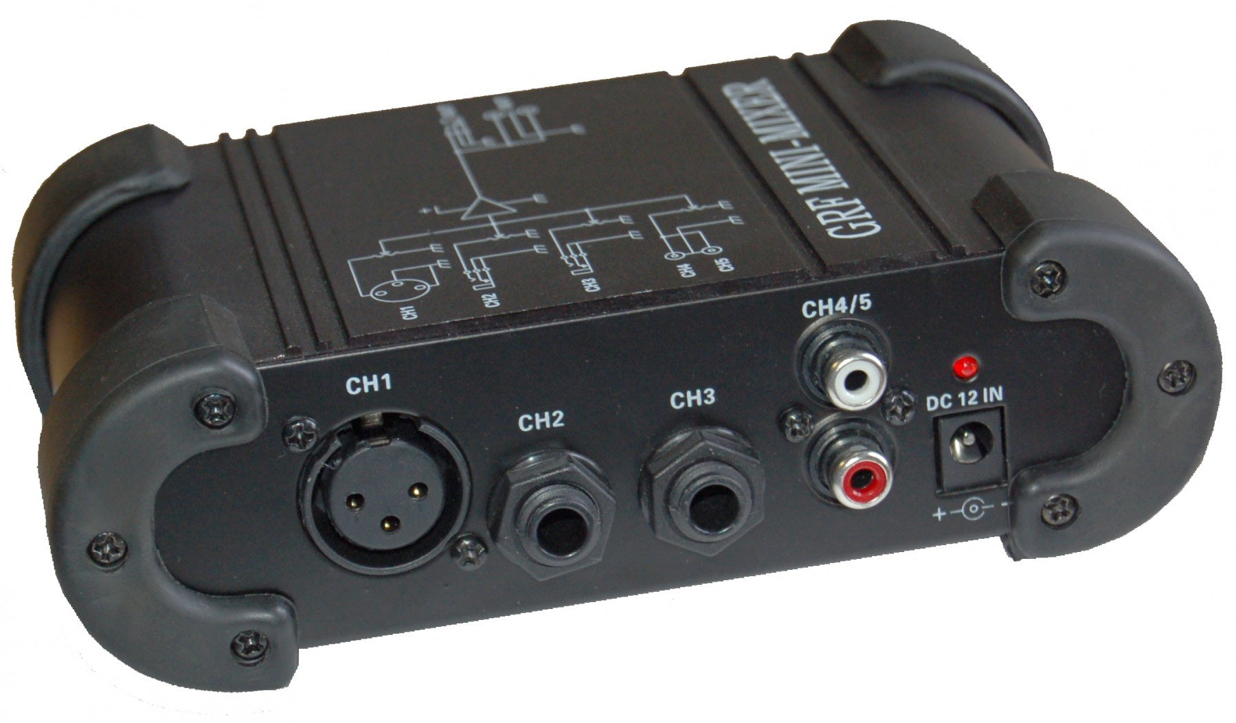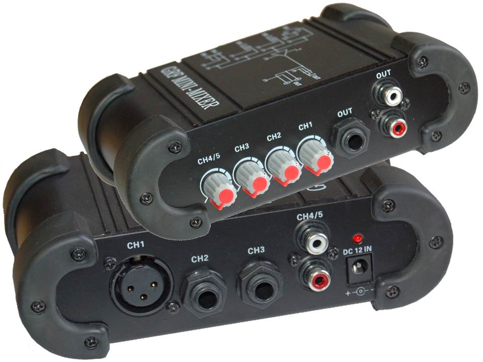A compact tabletop mixer with a choice of mono and stereo inputs and XLR Lo-z mic channel.