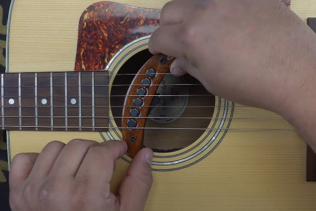 Simply drop this pickup into the soundhole of the guitar and gently tighten the mounting screws until it is firmly mounted to the top.So,no routing or drilling your instrument !