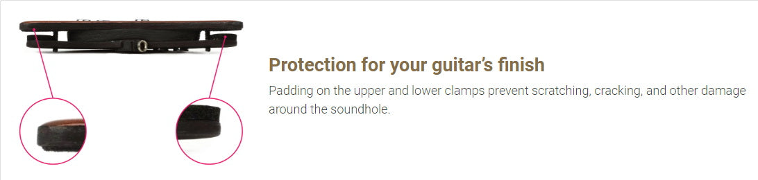 Padding on the upper and lower clamps prevent scratching, cracking, and other damage around the soundhole.