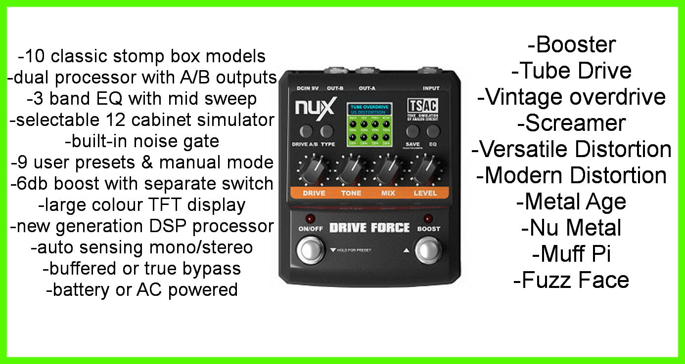 With ten models including booster, tube overdrive, and distortion, Drive Force gives you all pedal sounds you'll ever need. With its Dual Engine and A/B output, Drive force allows you to mix two-drive sounds together and pan it to two outputs. A switchable noise gate and 12 cabinet models can be applied to any of the models