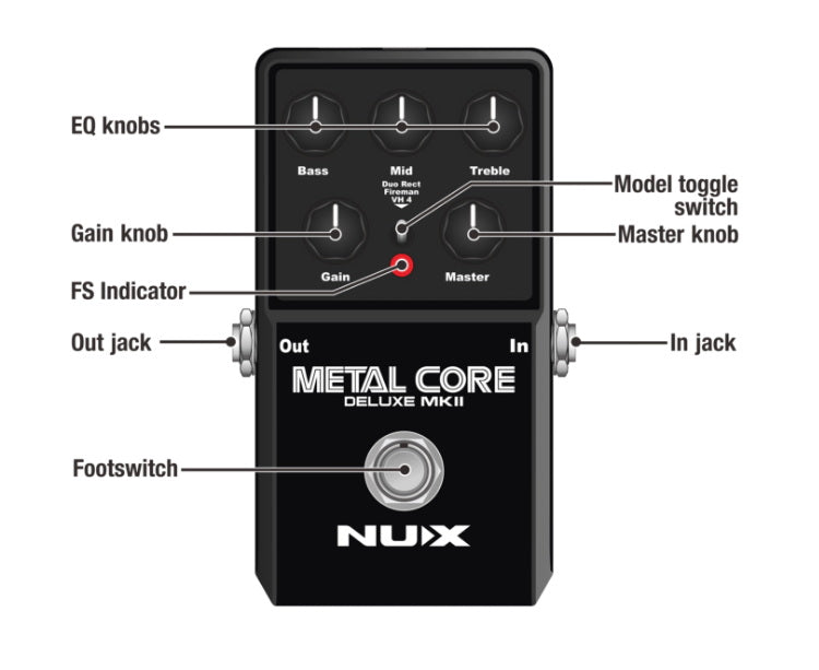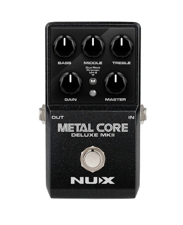 The NUX METAL CORE DELUXE MKII is a high gain preamp pedal with 3 distinctive high gain amp models including the Duo Rect, Fireman, and VH 4. You can select these models via the 3-way toggle switch.