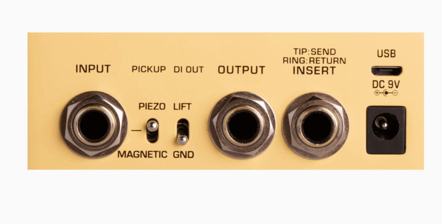 There are Gain and 3-band EQ controls on the pedal. Depending on the amplifier/speaker characteristic, playing style and acoustic guitar's body type, you can tune your sound the way you like by using the Gain knob, Bass, Middle and Treble control.