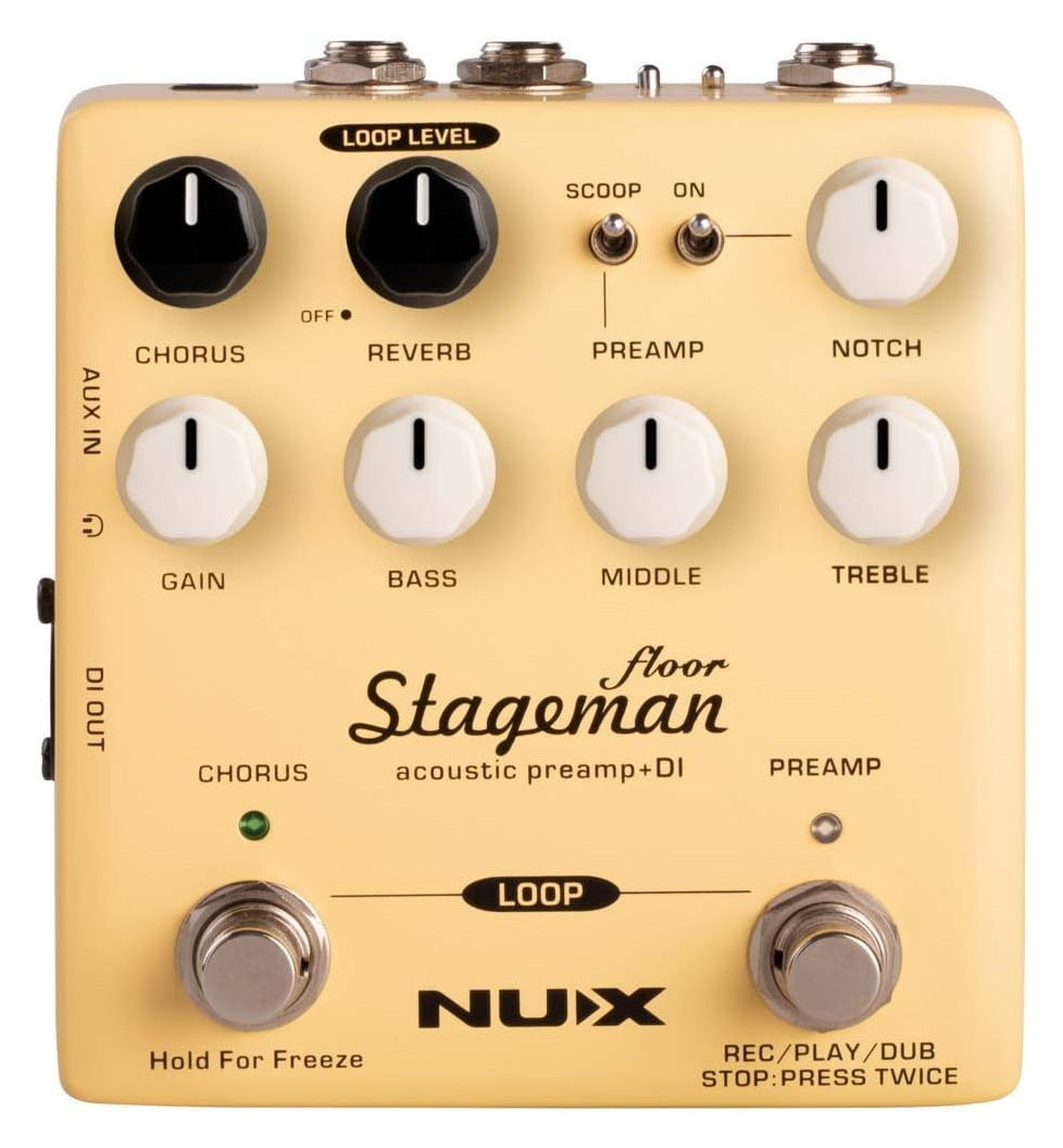 NUX Stageman Floor is an analog acoustic preamp with digital effects and looper function. It's a preamp, featuring a highly sensitive 3-band EQ with MID scoop toggle switch, an adjustable notch filter, and input gain control, provides ginormous headroom and delivers the sound all natural.
