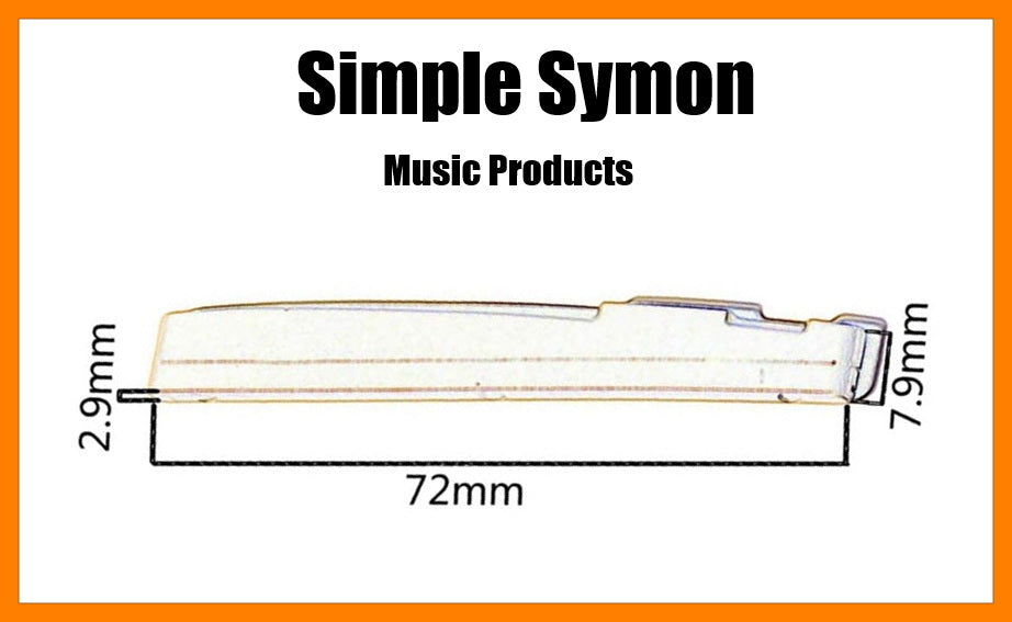 Acoustic Guitar Bridge Saddle, Authentic Pure Bone for enhanced tone ,note definition,and sustain over modern "plastic/resin" based saddles found on most mass produced acoustic guitars.A definite improvement that can be added to any acoustic guitar,with dramatic results. Sized to fit 72mm Bridge Slots.