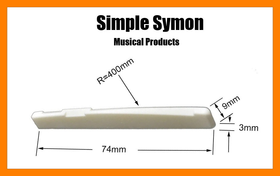 Acoustic Guitar Bridge Saddle, Authentic Pure Bone for enhanced tone ,note definition,and sustain over modern "plastic/resin" based saddles found on most mass produced acoustic guitars.A definite improvement that can be added to any acoustic guitar,with dramatic results. Sized to fit 74mm & 72mm Bridge Slots.