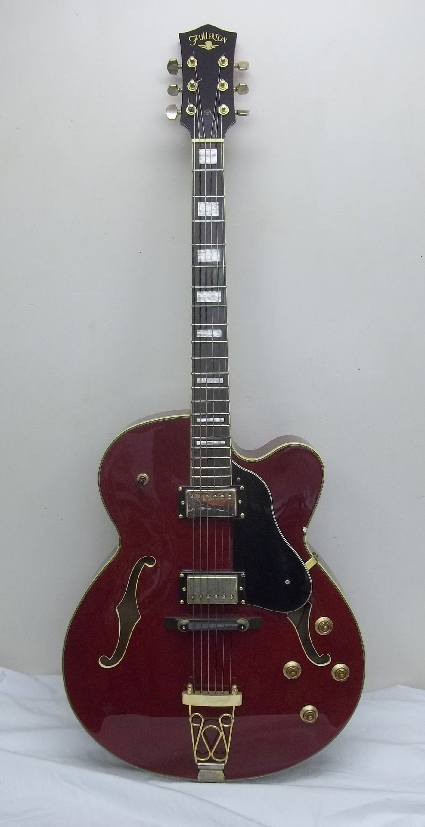 Fullerton was a limited production run of guitars built by Aria.This is a true archtop,with a floating top(no centre block) to allow the the guitar to fully resonate.Twin F-holes and double bound body.