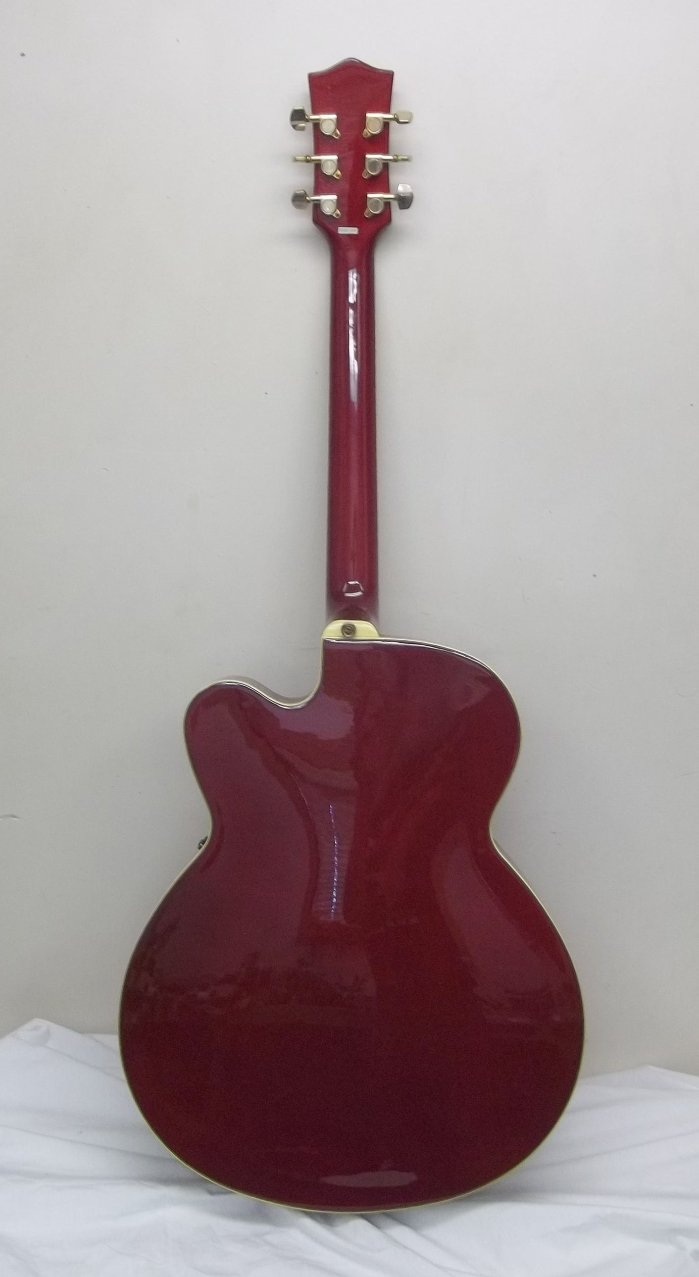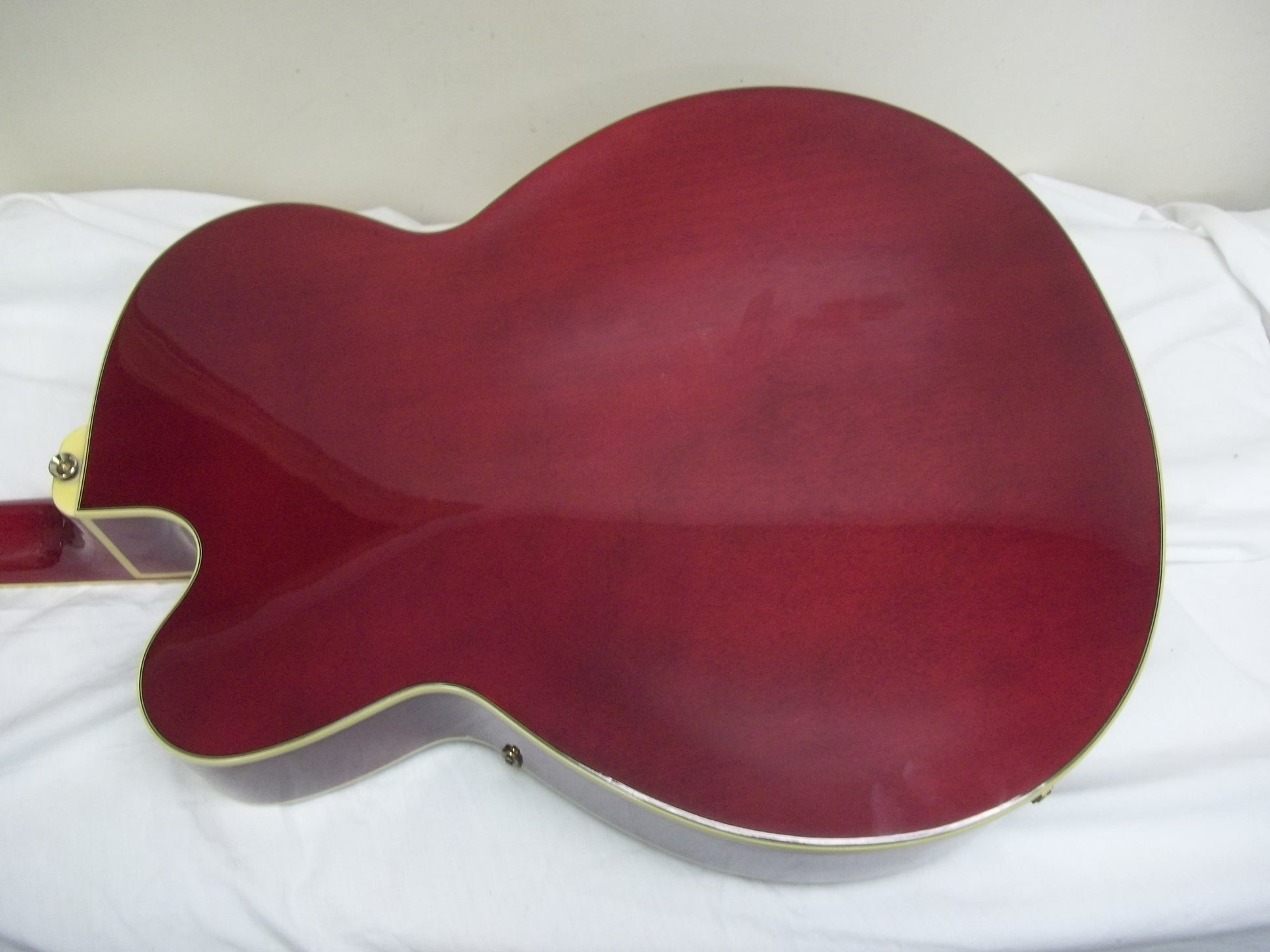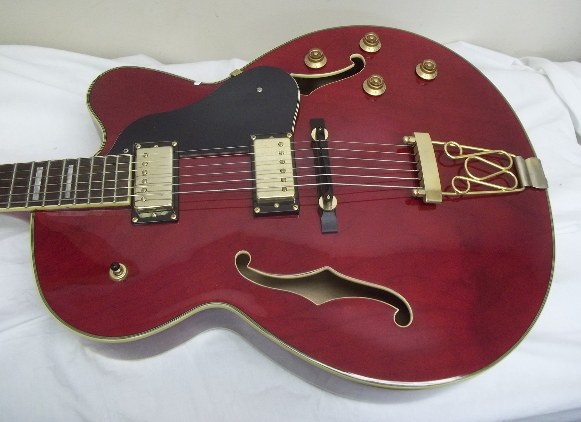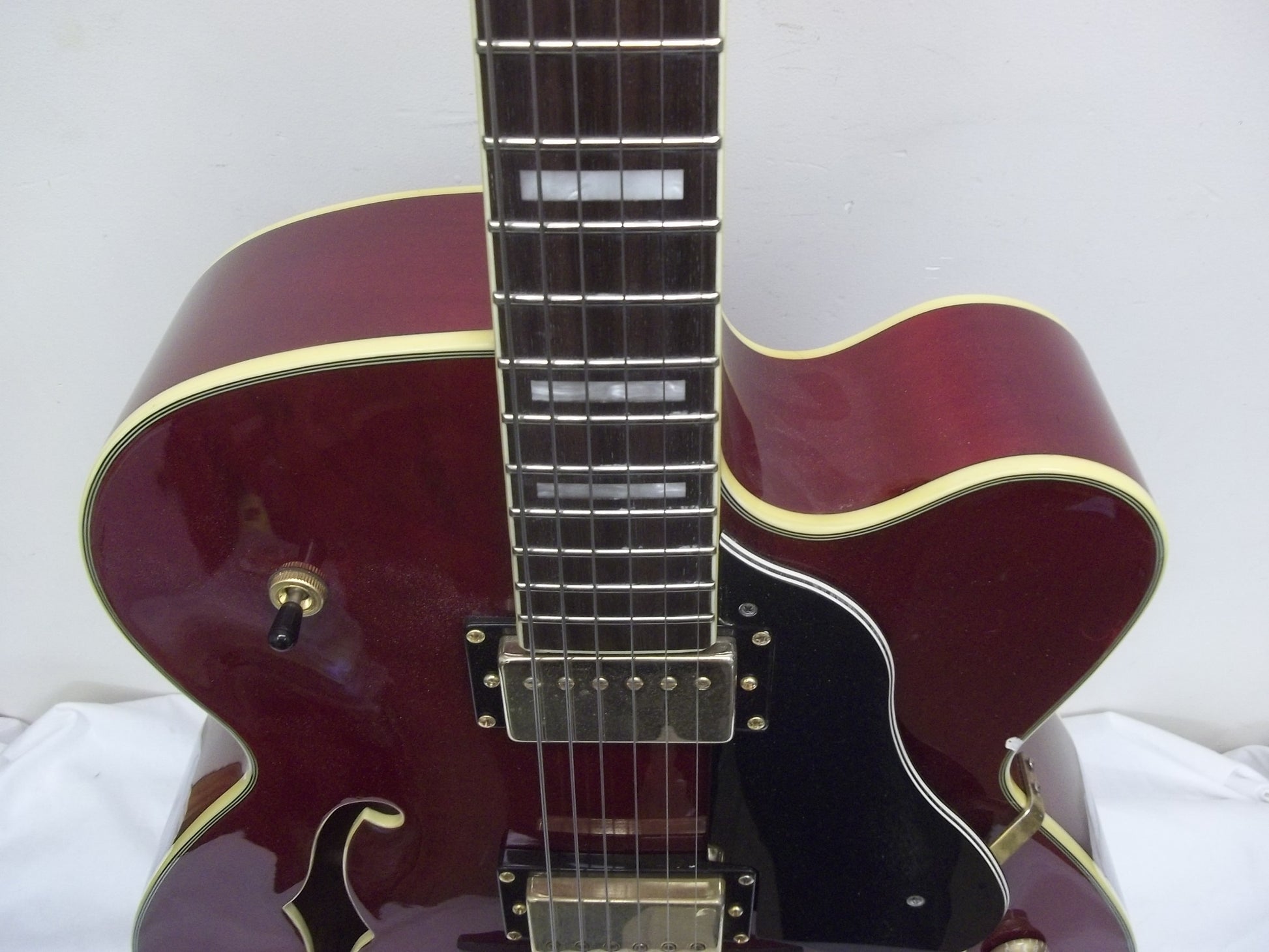 This big bodied archtop guitar is strung with 12-56 strings for that mellow yet fat ,warm jazzy tone.Dual humbucker pickups-each with separate volume and tone controls.Diecast machine heads.Rosewood adjustable bridge.