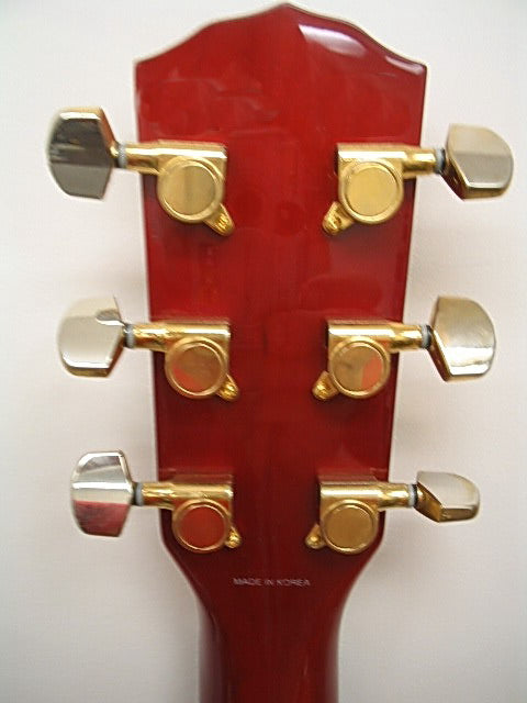 This is one of the highly regarded Made in Korea models and yes,you can tell ! This one has had plenty of time over the years,to age and stabilize,offering some pretty amazing tone and projection.Solid ,flamed maple top done in a beautiful transparent crimson gloss.
