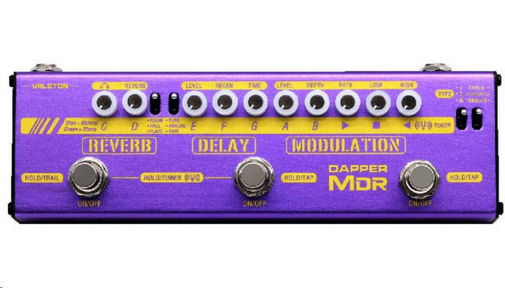 First in line is a stealth fast and accurate tuner so you can play confidently in tune. Hold both DELAY and REVERB module ON/OFF switches to enable the TUNER. When this module is activated, Dapper MDR will be MUTED.